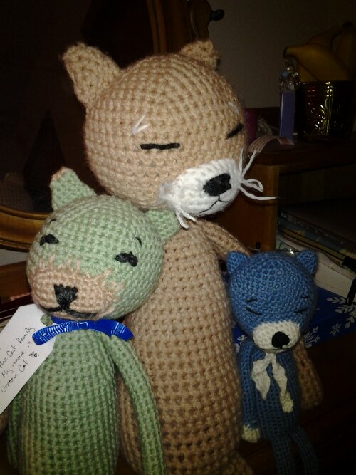 Blue Cat’s creator made Green Cat for her 2-year-old niece. He’s of medium size and is crocheted from worsted-weight acrylic yarn (that inexpensive but durable Red Heart kind). Since his new owner is only 2, Green Cat had to be virtually indestructible. Blue Cat thinks he’s some kind of super-hero…
