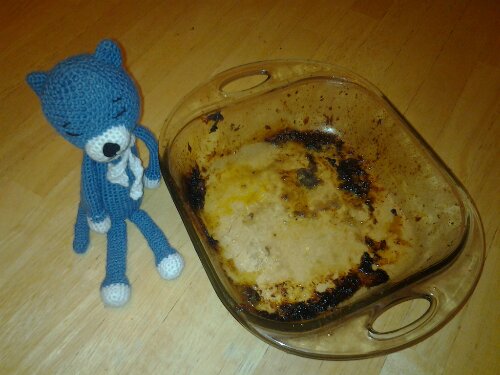 Blue Cat’s family had meat loaf for dinner the other night. Yummy meat loaf with carrots inside, and 3 kinds of ground meat. The problem is that yummy meat loaf takes a long time to cook, and the baking dish can get quite crusty…