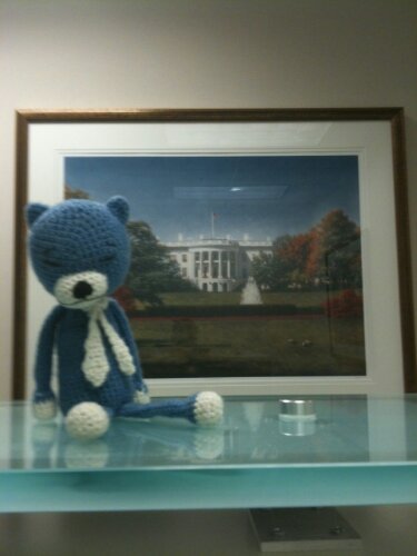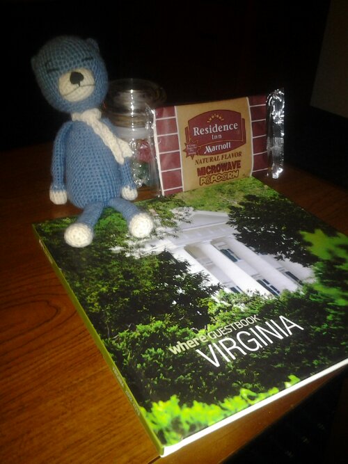 Blue Cat really likes the Residence Inn – they have big rooms, a free hot breakfast (he had scrambled eggs and sausage every morning), and an evening light meal that takes the place of dinner. And they know how to treat a crocheted cat – no hiding in bags in this room!