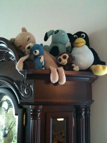 It was a great idea, but he forgot that this was also the place he goes to hide from his scribe’s granddaughter when she visits. And so when the other stuffed animals saw him up there, they thought a toddler visit was imminent. And they started to join him.