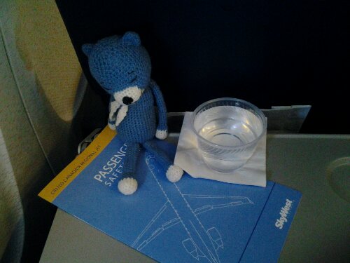 Flying is amazing! Blue Cat was going around 500 miles per hour, while having his favorite beverage (water) and enjoying a view of the tops of the clouds. Here he is in seat 7A: