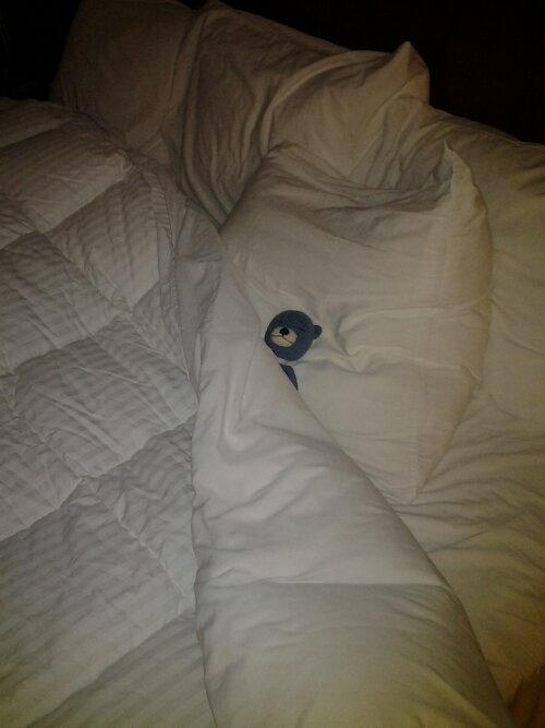 And then there’s sleeping. At home Blue Cat rarely gets to sleep in a bed, because the dogs get there first and Blue Cat has a remarkable resemblance to a dog toy. But at the hotel he can jump into bed early and enjoy a soft mattress and fluffy pillows.