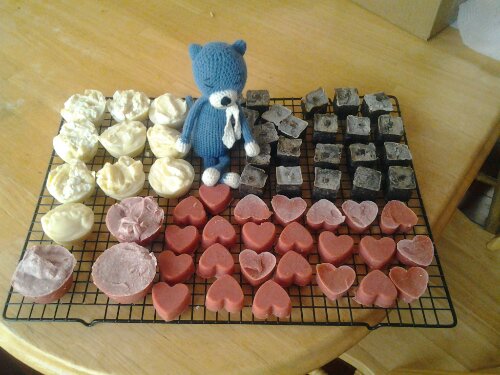 What kinds of soap ? The white ones are Aloe, the brown ones are Aloe-Oatmeal-Cinnamon, and the red ones are Aloe-Oatmeal. Blue Cat is hoping for some ice cream soap next, because he really likes ice cream. (Scribe Note: Blue Cat doesn’t realize that ice cream can’t be put in soap, but no one wants to break the news to him.)