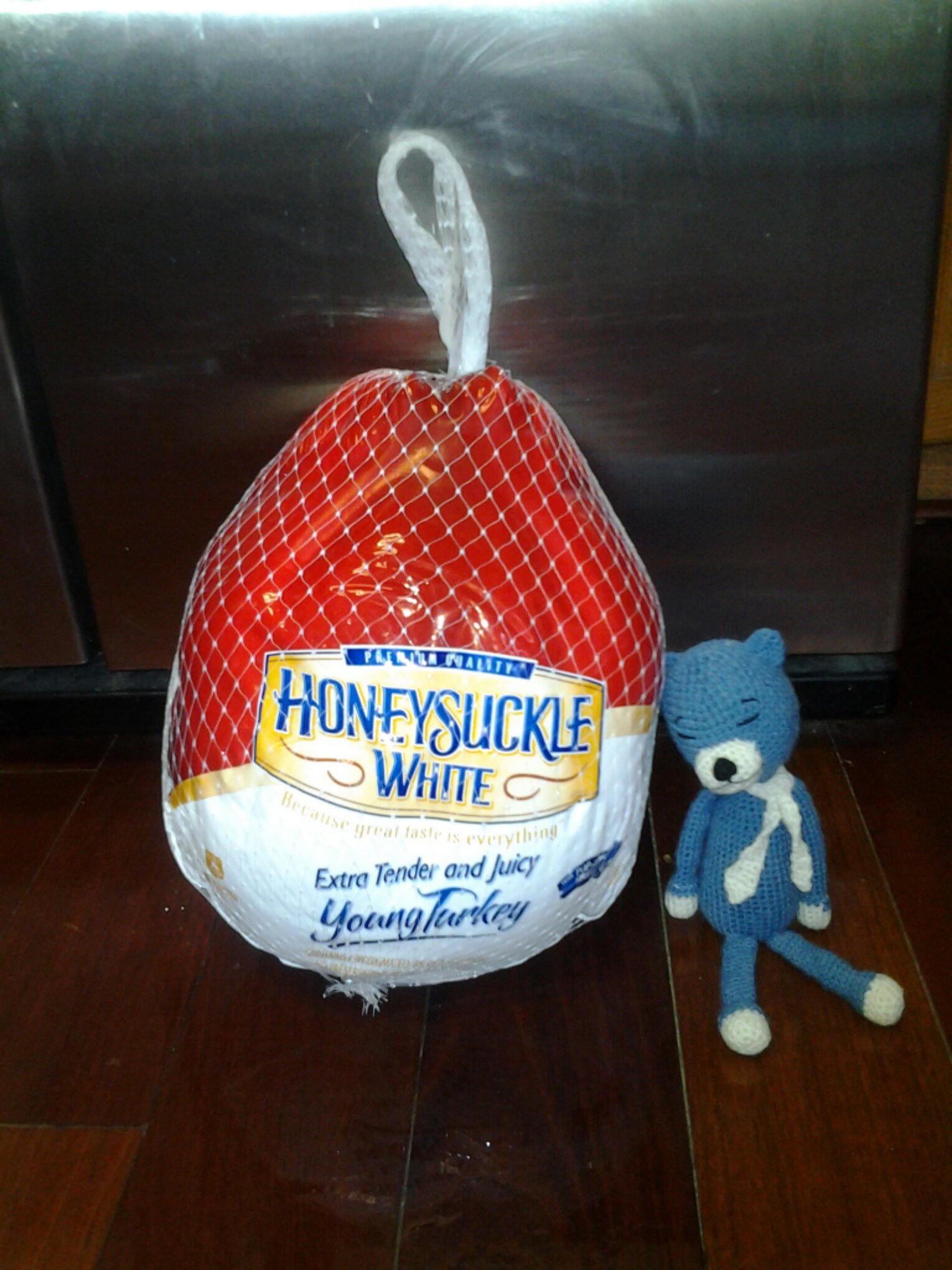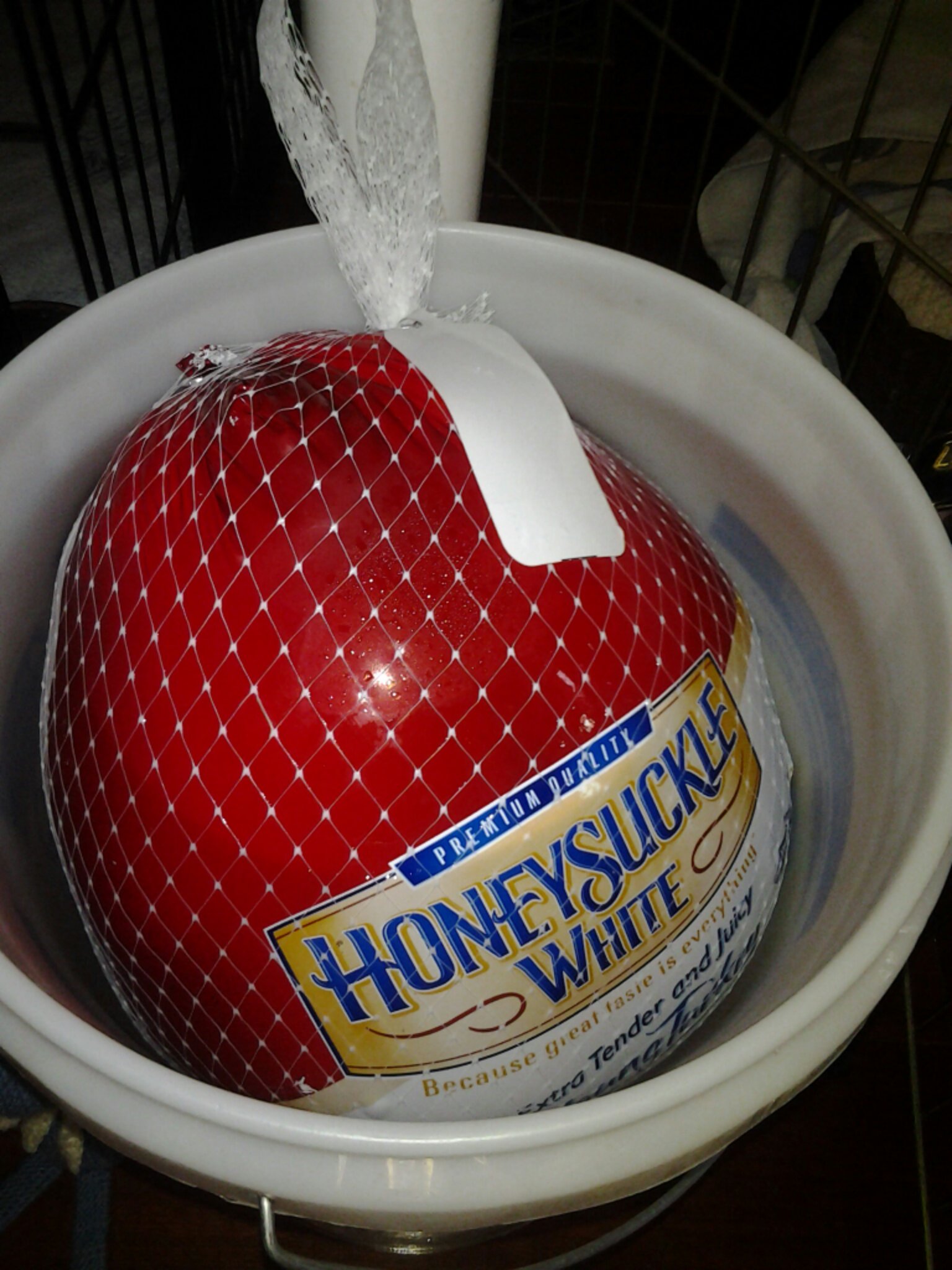 But Blue Cat had a problem – all the store had left were frozen turkeys. And, although the wrapper says that an 18-pound turkey will defrost in the refrigerator in 4 days, Blue Cat didn’t believe it. Especially since one of the turkeys would be in the refrigerator in the garage, where the outside temperature is below freezing.