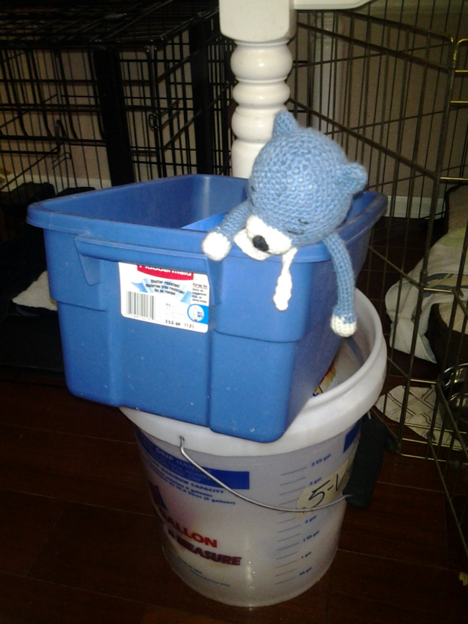 Blue Cat found the right bucket at Lowe’s – but the 5-gallon orange ones at Home Depot would work as well.