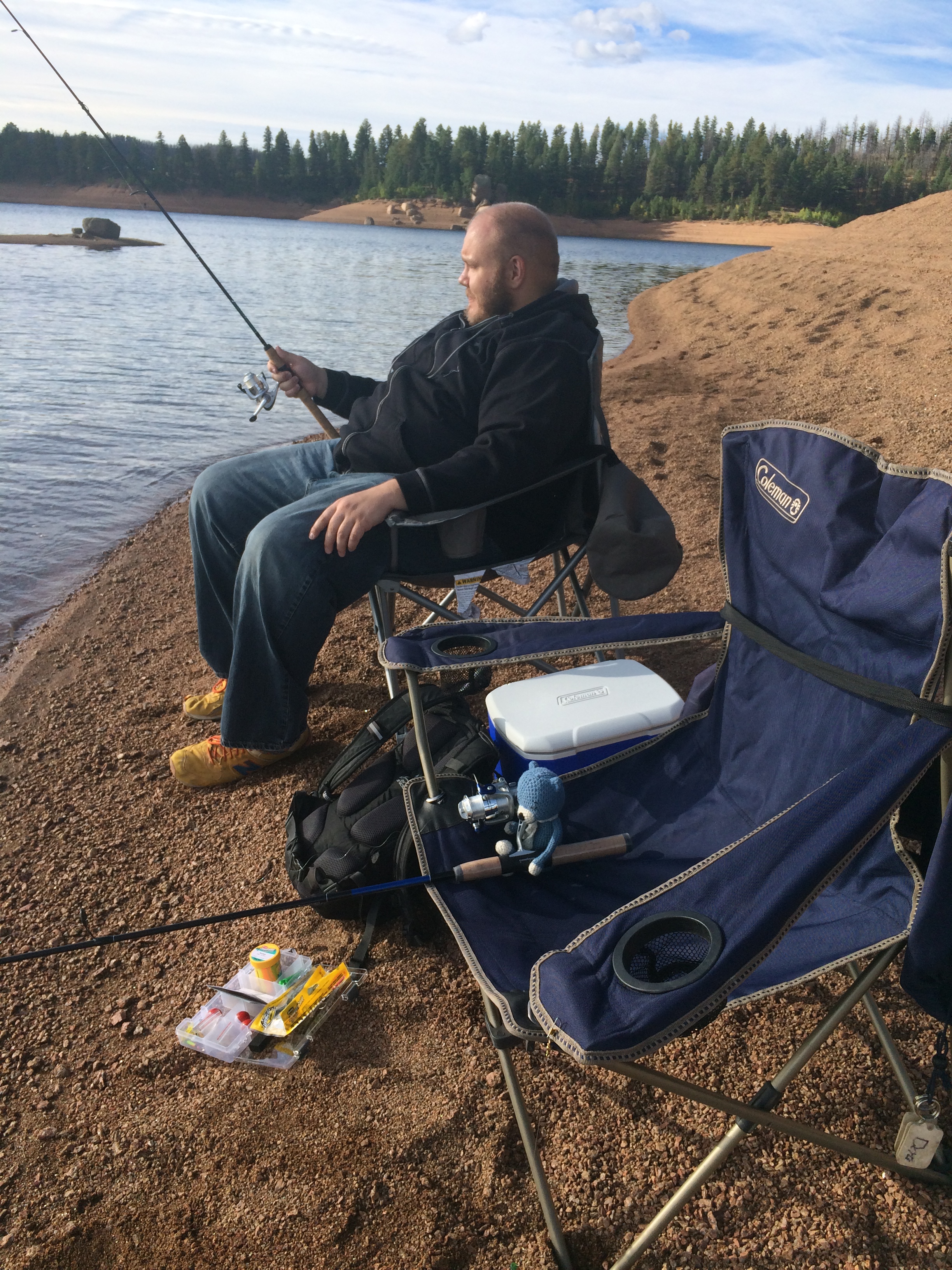 Today was Labor Day (a celebration of the contribution of workers) in the United States and so Blue Cat got the day off. His scribe’s son set up a fishing trip for Blue Cat and his scribe, so off they went to Rampart Reservoir. Located in the Pikes Peak National Forest in Colorado, the reservoir is at an altitude of 9,000 feet and is really big (13 billion gallons big). And it’s stocked every two weeks or so with tasty trout.
