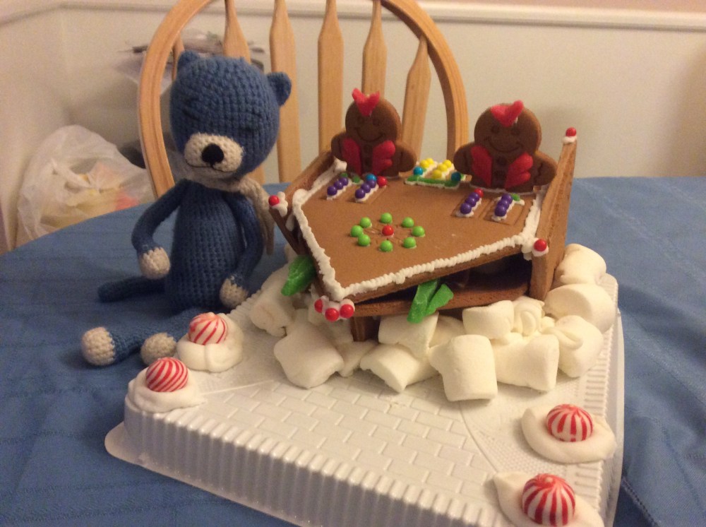 Since it was the holidays, Blue Cat decided that the contest would be to determine who could build the best gingerbread house. He had a couple of gingerbread house decorating kits from last year – you’d be surprised how much shelf life gingerbread and icing have – and gave them to two teams from his scribe’s family. And they went to work.