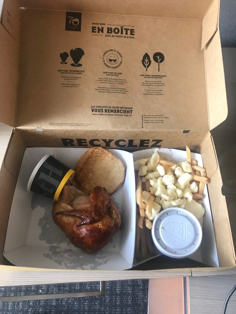 Blue Cat’s first day was in the hotel room for some virtual meetings – not very interesting but it helped him get used to being in Quebec. The hotel (Courtyard Quebec City) was very nice, and their restaurant had the greatest breakfast potatoes Blue Cat had ever had. But they didn’t serve lunch – so Blue Cat ordered delivery from the St-Hubert restaurant. Rotisserie chicken with coleslaw, a bun (toasted) and a side (usually French fries). Blue Cat splurged and got poutine (French fries and cheese curds with a brown gravy) and it was wonderful!