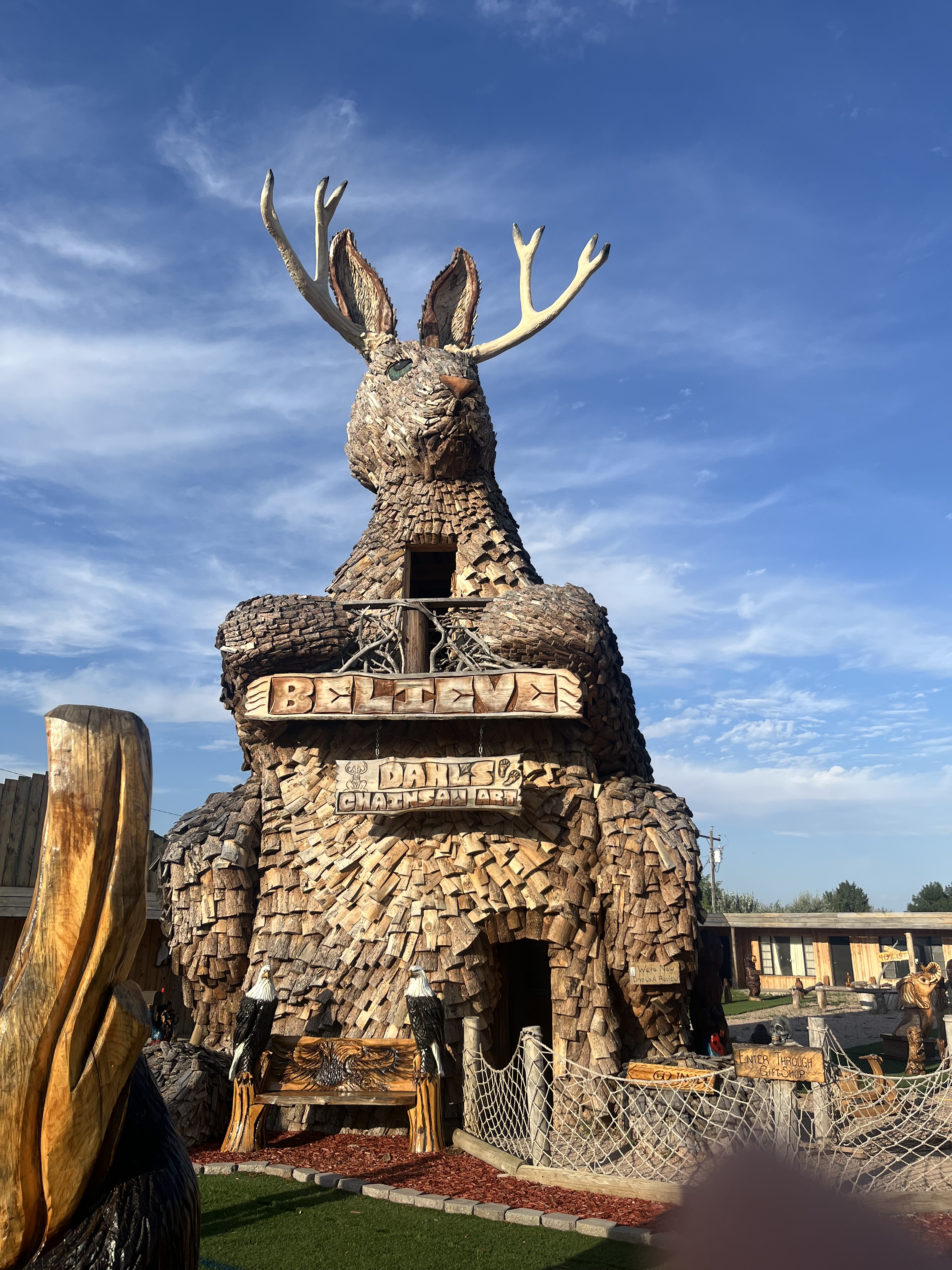 Right next door was Dahl’s Chainsaw Art Studio, where massive wooden sculptures (including mythical creatures) are carved from tree trunks. There, Blue Cat met the largest jackalope statue he had ever seen.